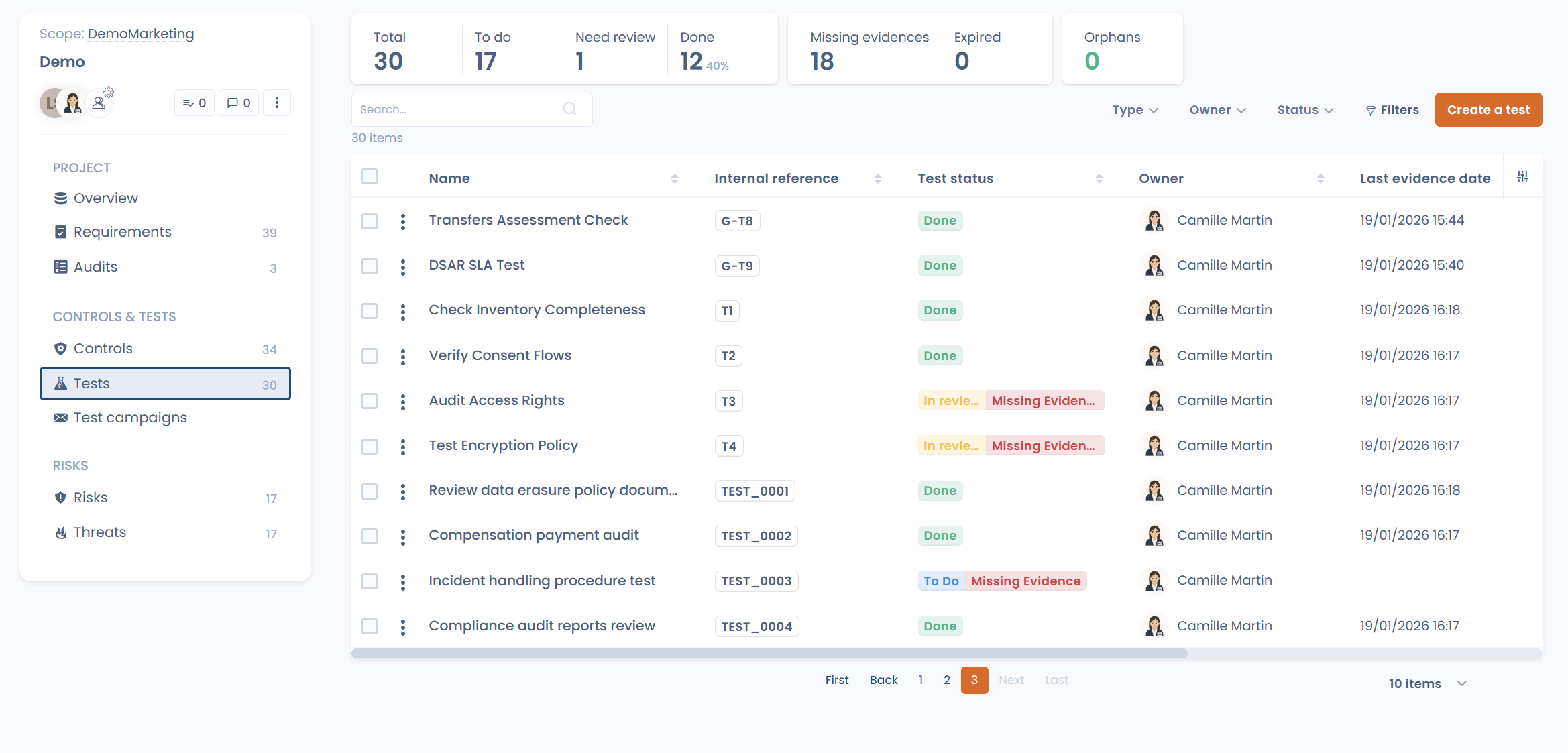 A test verifies that the control is actually implemented and working as expected. It can be manual or automated, one-off or recurring. **Evidence is a tangible proof that a control was tested and respected: screenshots, documents, logs, reports, tool exports, etc. Without evidence, a control does not exist in the eyes of an auditor.