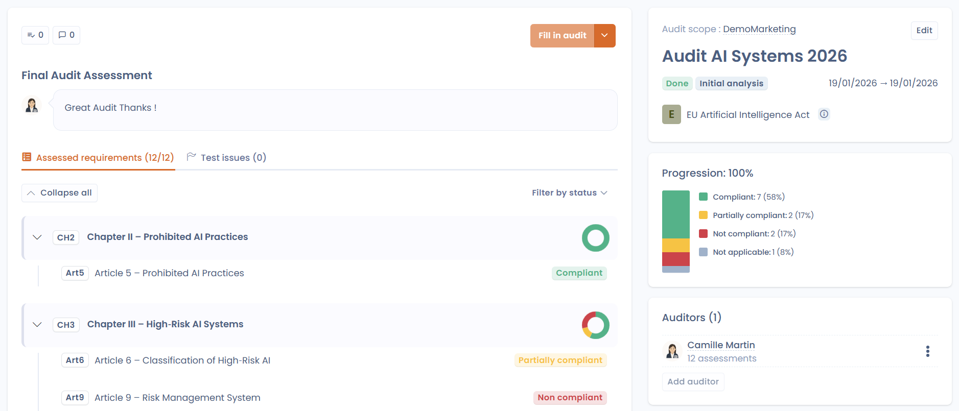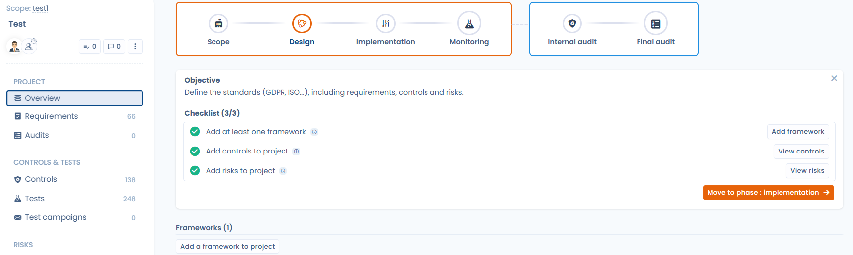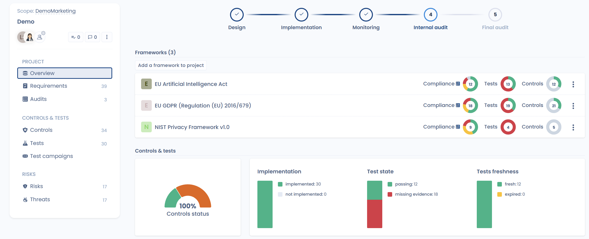 The associated dashboard provides instant visibility into compliance project progress, implemented controls, completed tests & collected evidence.
